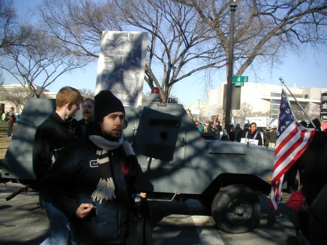 Armored Vehicle: No, this is not a shot from some "third world" nation - it's a photo of an armored personnel carrier of some sort rolling through the streets of downtown D.C. Raphi in the foreground and the Corporate Flag to the side add to the atmosphere of the moment, clashing worldviews travelling together down the same road. Which path will the people of this nation and the world follow?