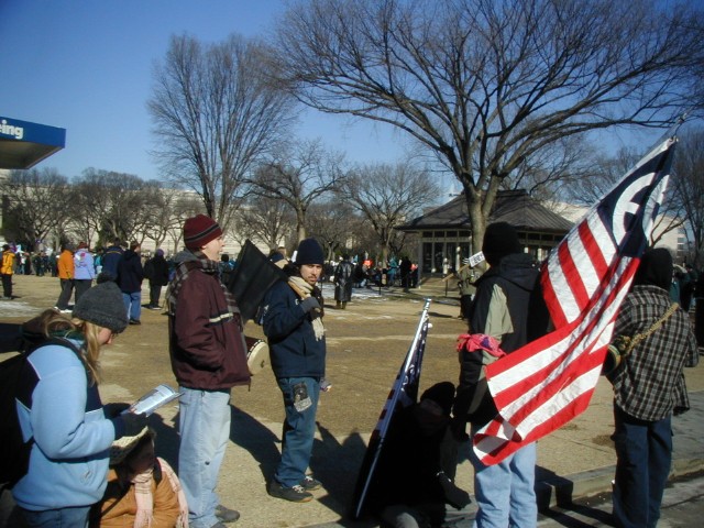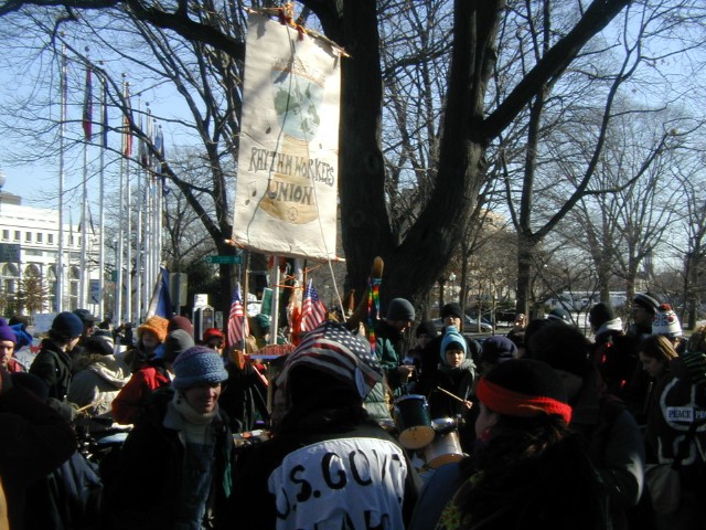 Carbondale Crew at Rest: I didn't get any good pictures of the entire 46 person contingent that went to DC, but here's a shot of a few of the people that I spent a good amount of time with out there. Leah is looking at a map, figuring out what building we're staring at as we wait for everyone to march. Lisa is resting her legs after a long stretch of walking, getting ready for the longer walk ahead. Pat is yawning with intense anticipation of the coming hours. Raphi is scowling with black flag in hand, ready for the revolution. Joel is sitting with the same Corporate Flag that won him a second-page photo in the New York Times last year. Marc is weilding his homemade American Peace flag, which he often loans me at the Carbondale peace vigils. Tony is banging the drums of peace. And in between taking pictures, I'm trying to keep the feeling in my fingers on this cold, cold day with an icy metal flagpole in my hands!