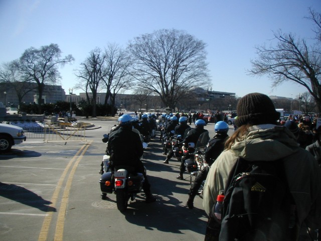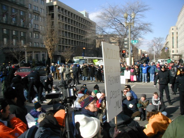 My favorite experience from this day was one that I didn't get a picture of. A very small group of mostly women - maybe five or so - began singing "All we are saying is give peace a chance," over and over again. After two days of raising angry, militant energy against the war, this was a wonderful counterbalance for me. After a while, I and a few dozen others joined with them. The police became visibly more relaxed, and the demonstrators who were hell-bent on angry energy went off to another spot to carry that with them. It was a beautiful moment - all thoughts of time faded away as we spent as much as an hour or more chanting this single verse, drawing down the energy of peace and sharing it with the world through our voices. There were a few moments of this captured in the documentary "We The People," but it's hard to fully appreciate without having been there.