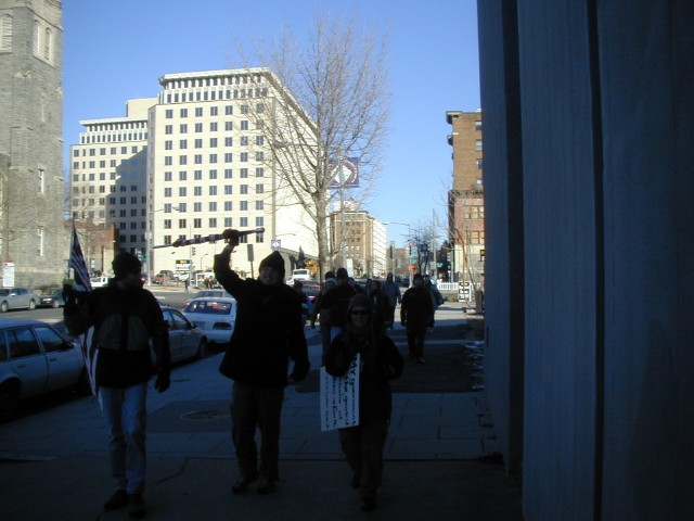 Onward: Here we have a cluster of Carbondaleans taking their first steps from the hostel we stayed at to the march for peace. In the foreground, we have Marc, Joel, and Jen. In the background, I can make out Lisa, Pat, Tracy, and Raphi, but can't make out or remember who the others were. Maybe next time I'll be quick enough to get a photo like this while we're all still in the sunshine! Note Joel's refreshing revolutionary enthusiasm.