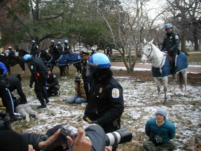 Down in Front: An affinity group of maybe two dozen people decided to do a sit-down protest in the street. Before they could even make it to the center, the police stopped them, leaving them sitting off to the side. The police carried them over to the side of the street, and eventually they decided that holding a few feet of blacktop off of the curb wasn't doing much good and wasn't worth getting arrested for.