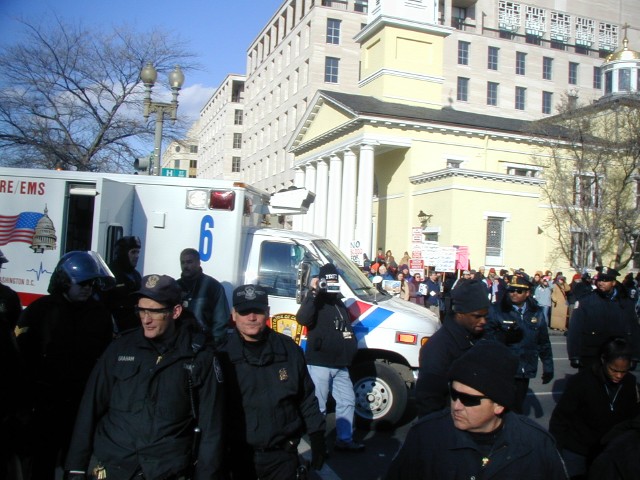 Collateral Damage: An older woman who sat in the street was lifted and thrown rather callously onto the pavement to get her out of the street. She suffered unknown injuries and had to be taken away on a stretcher in an ambulance. Even before Bush's ultimatum and war, the collateral damage had already begun... notice the gentleman in the center of the picture who is recording the crowd. I do so enjoy taking pictures of the picture-takers...