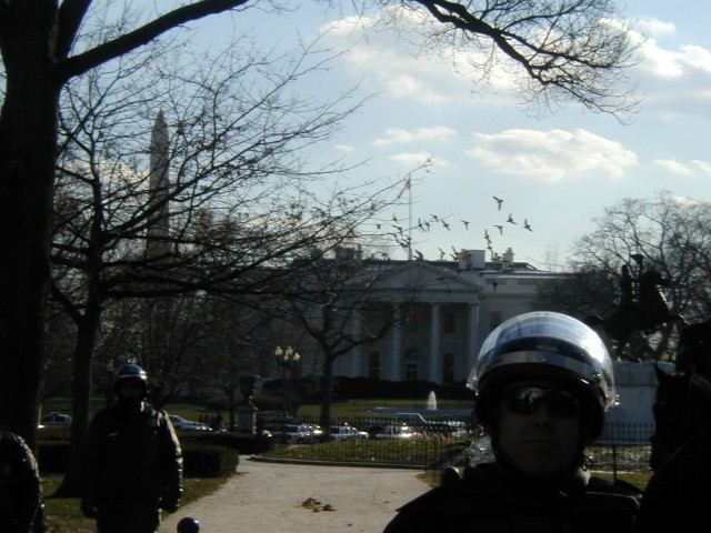 The Horses Speak: If you look at the sidewalk at the bottom of this picture, you may notice a large pile of horse poop lying on the well-guarded path to the White House. This wasn't the only one - the whole area was littered with fragrant feces. It would seem that the horses have made their statement on this war and our supposed President.