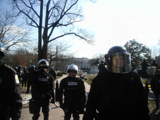 Behind Bars: When the police tried to divert the weapons inspection march from the White House, we managed to make our way there anyway. What can I say - we're quicker on our feet than their regimented batallions! As we came to the fence, several people decided to hop it and make a break for the White House. Needless to say, the police did not appreciate this and made several arrests.
